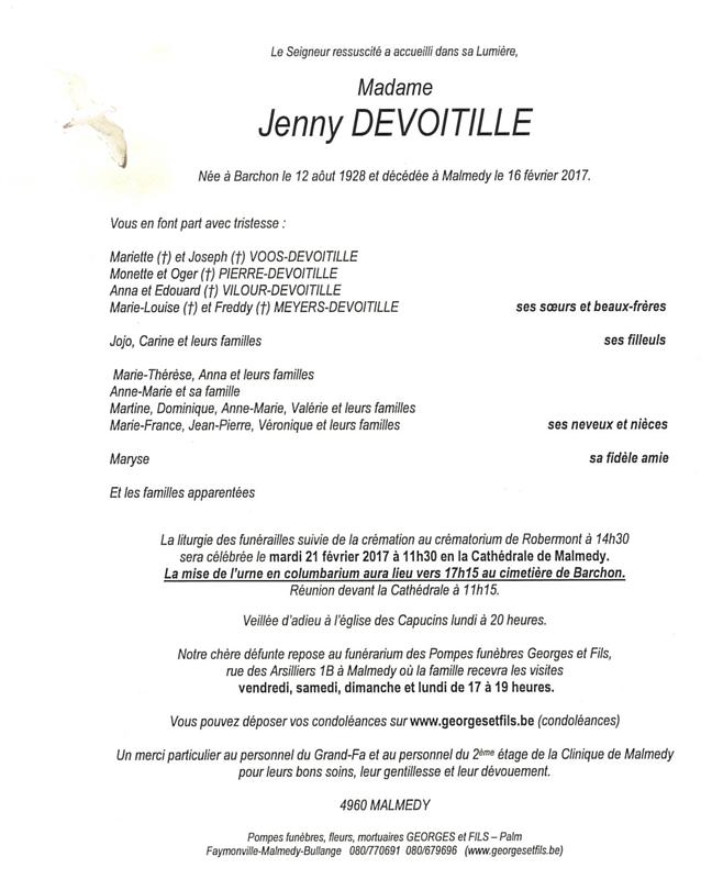 Décédée à Malmedy (4960) le jeudi 16 février 2017 à l'âge de 88 ans