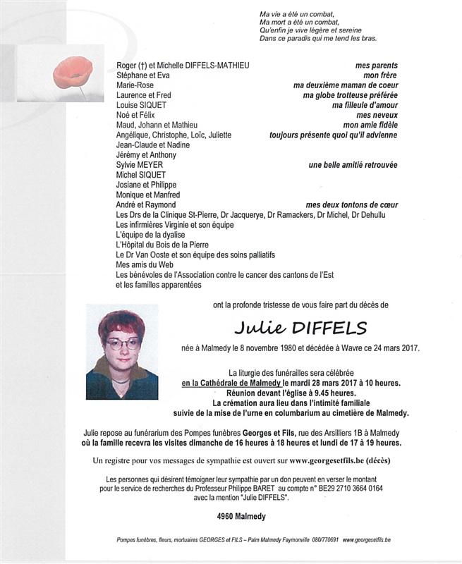 Décédée à Wavre (1300) le vendredi 24 mars 2017 à l'âge de 36 ans