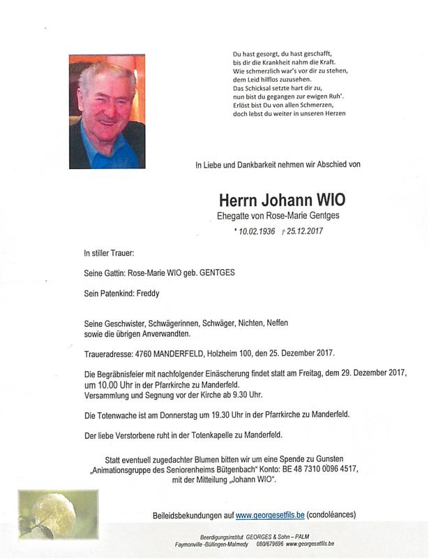 Décédé à Bütgenbach (4750) le lundi 25 décembre 2017 à l'âge de 81 ans
