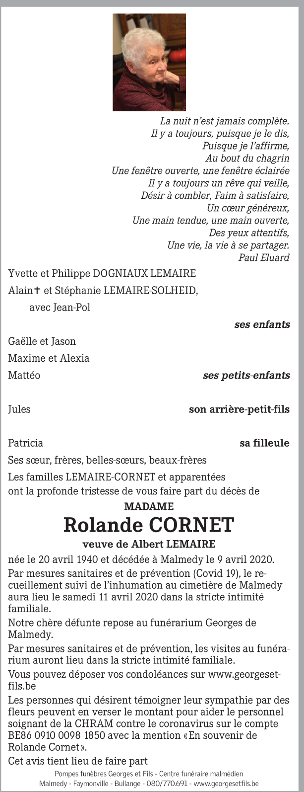 Madame Rolande CORNET veuve de Albert LEMAIRE