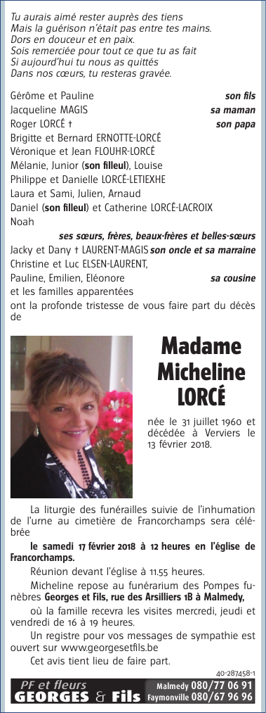 Décédée à Verviers (4800) le mardi 13 février 2018 à l'âge de 57 ans