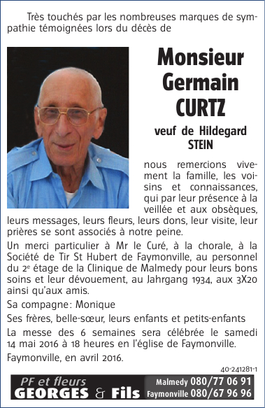 Décédé à Malmedy (4960) le lundi 11 avril 2016 à l'âge de 82 ans