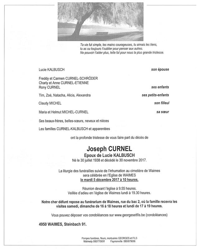 Décédé à Steinbach (4950) le jeudi 30 novembre 2017 à l'âge de 79 ans