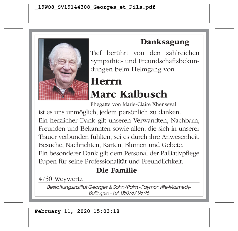 Décédé à Weywertz (4750) le samedi 25 janvier 2020 à l'âge de 83 ans