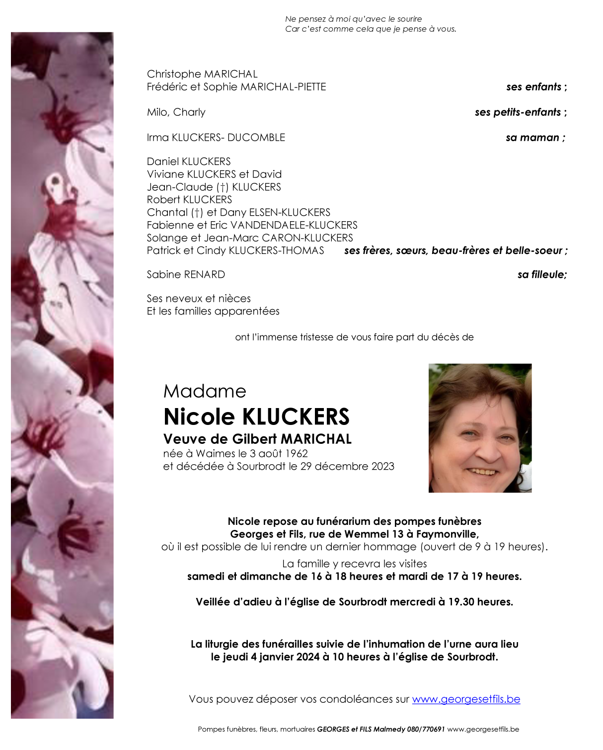 Décédée à Sourbrodt (4950) le vendredi 29 décembre 2023 à l'âge de 61 ans