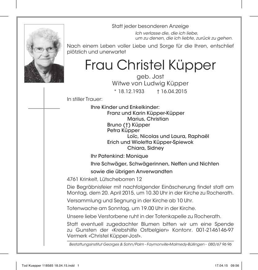 Décédée à Saint-Vith (4780) le jeudi 16 avril 2015 à l'âge de 81 ans