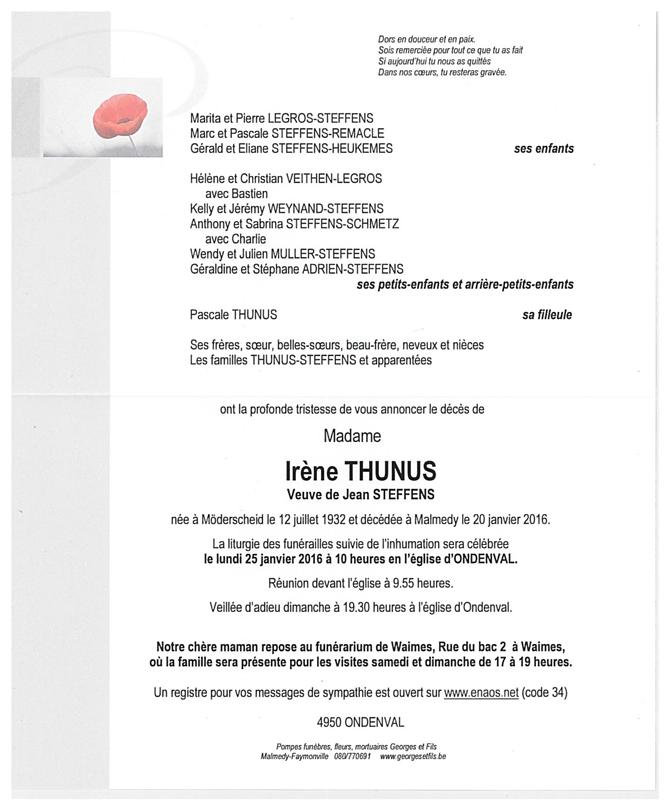 Madame Irène THUNUS veuve de Jean STEFFENS