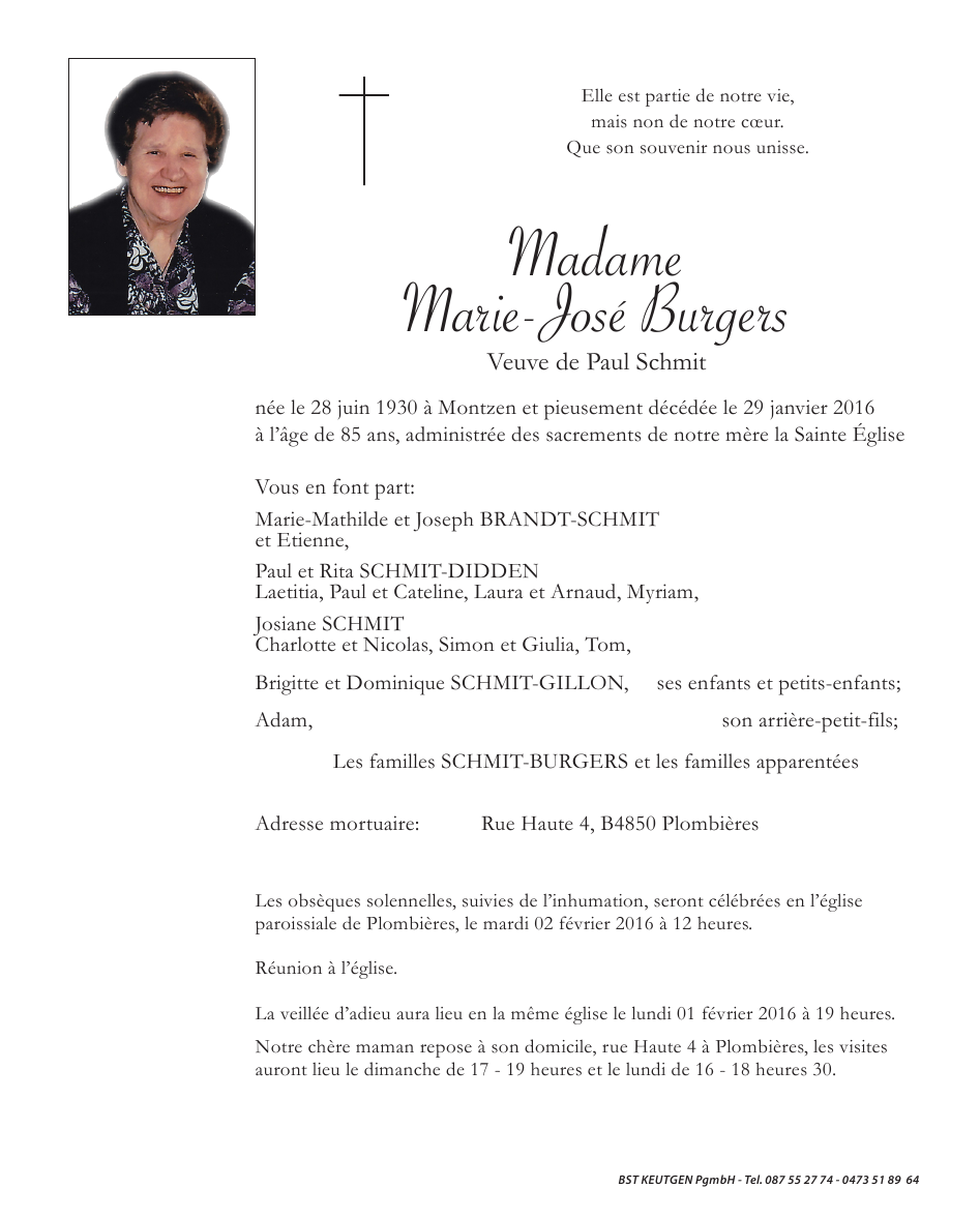 Décédée à Plombières (4850) le vendredi 29 janvier 2016 à l'âge de 85 ans