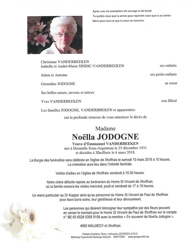 Madame Noella JODOGNE veuve d'Emmanuel VANDERBEEKEN