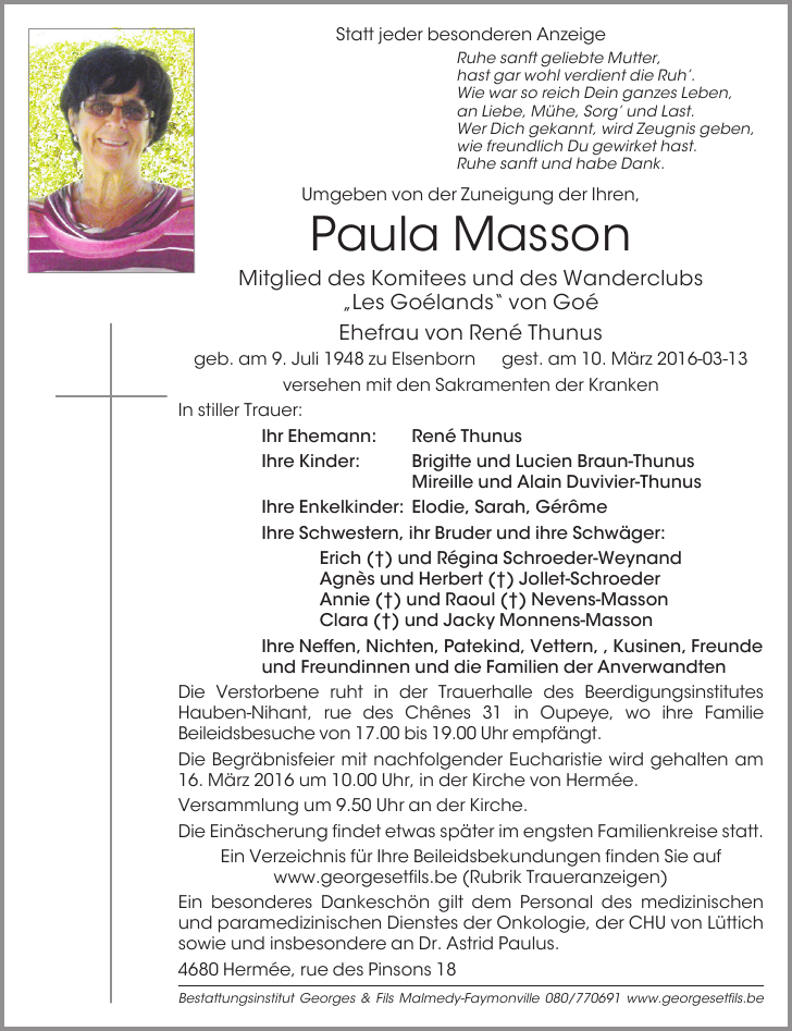 Madame Paula MASSON épouse de René THUNUS
