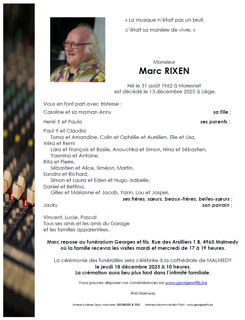 Décédé à Liège (4000) le samedi 13 décembre 2025 à l'âge de 63 ans