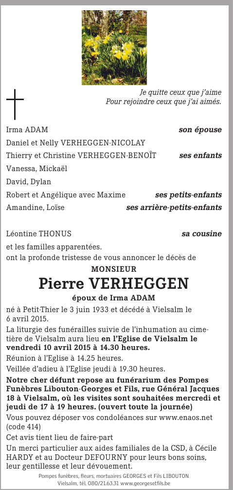 Décédé à Vielsalm (6690) le lundi 6 avril 2015 à l'âge de 81 ans