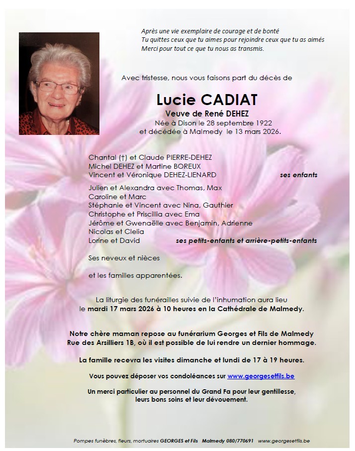 Décédée à Malmedy (4960) le vendredi 13 mars 2026 à l'âge de 103 ans