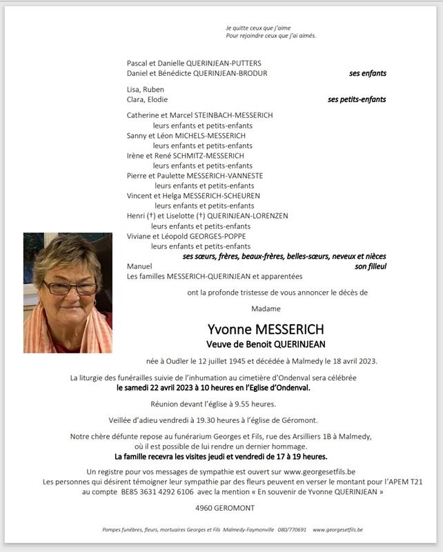 Madame Yvonne MESSERICH veuve de Benoit QUERINJEAN