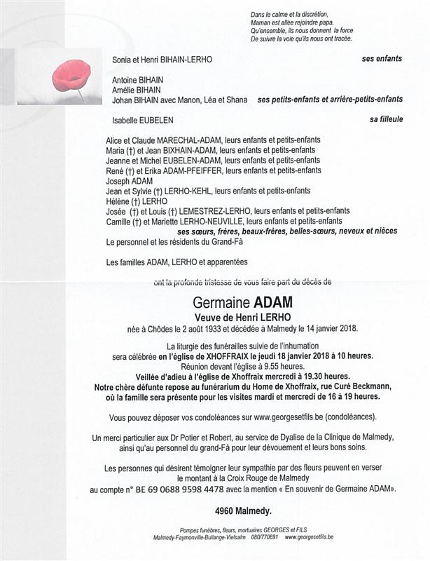 Décédée à Malmedy (4960) le dimanche 14 janvier 2018 à l'âge de 84 ans