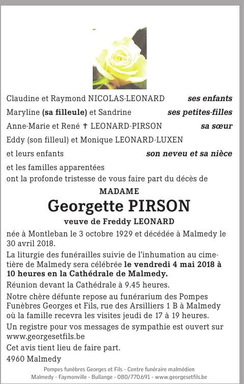 Madame Georgette PIRSON veuve de Freddy LEONARD