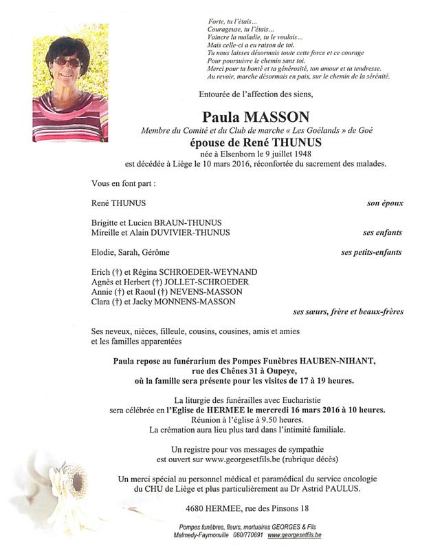Décédée à Liège (4000) le jeudi 10 mars 2016 à l'âge de 67 ans