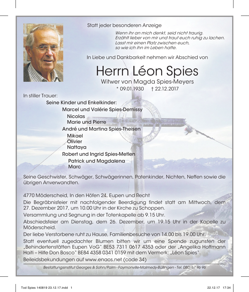 Décédé à Saint-Vith (4780) le vendredi 22 décembre 2017 à l'âge de 87 ans