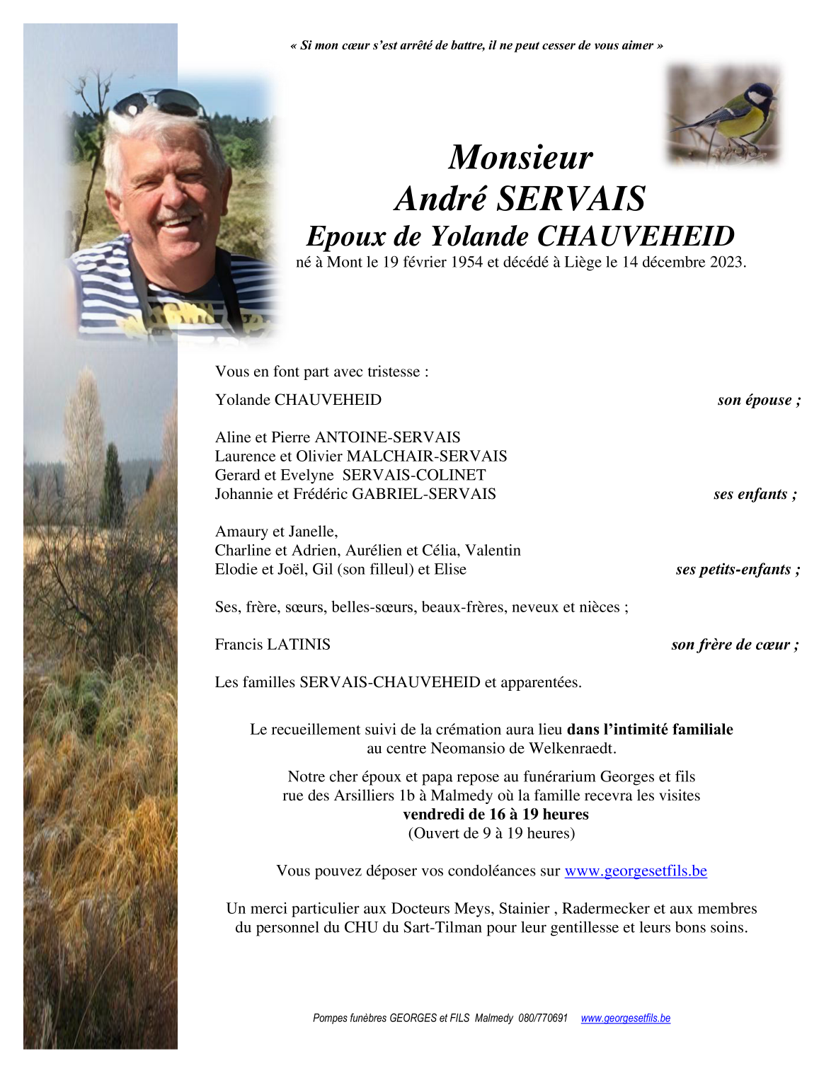 Né à Xhoffraix (4960) le vendredi 19 février 1954