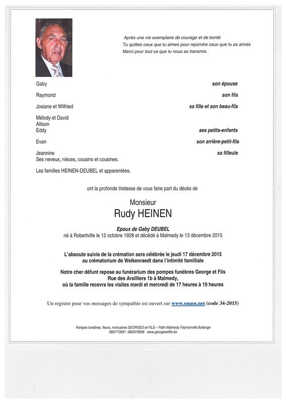 Décédé à Malmedy (4960) le dimanche 13 décembre 2015 à l'âge de 87 ans