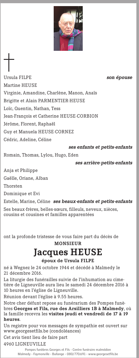 Décédé à Malmedy (4960) le mercredi 21 décembre 2016 à l'âge de 72 ans