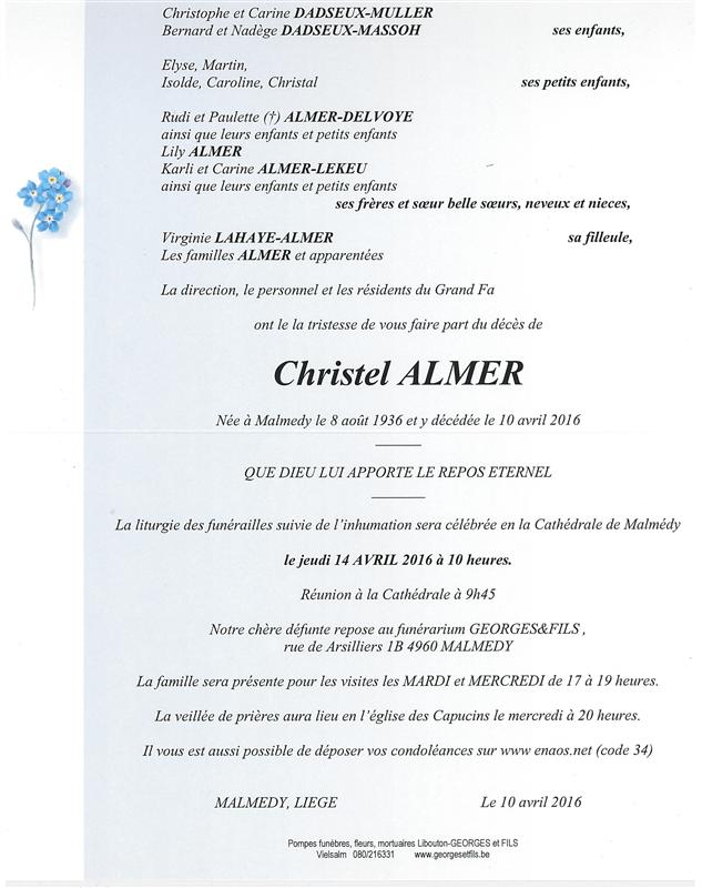 Décédée à Malmedy (4960) le dimanche 10 avril 2016 à l'âge de 79 ans