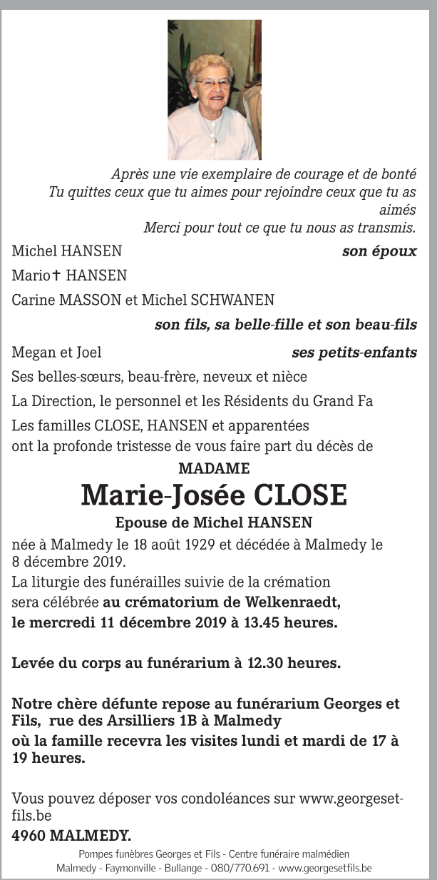 Madame Marie-Josée CLOSE épouse de Michel HANSEN