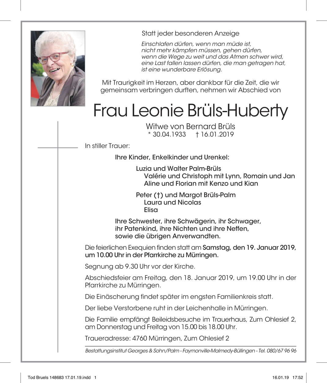 Décédé à Mürringen (4760) le mercredi 16 janvier 2019 à l'âge de 85 ans