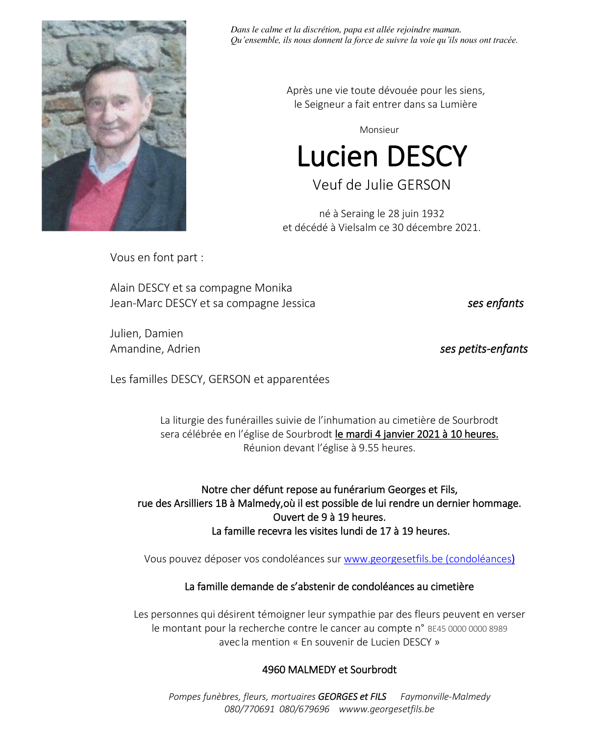 Décédé à Vielsalm (6690) le jeudi 30 décembre 2021 à l'âge de 89 ans