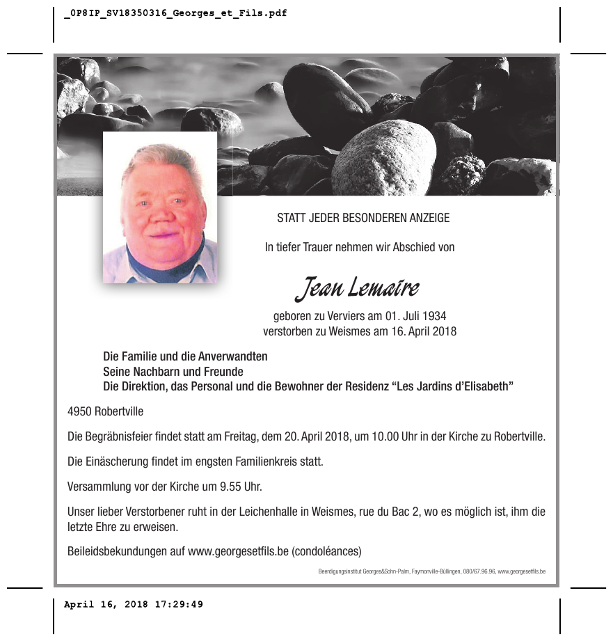 Décédé à Waimes (4950) le lundi 16 avril 2018 à l'âge de 83 ans