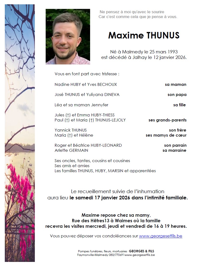 Décédé à Jalhay (4845) le lundi 12 janvier 2026 à l'âge de 32 ans