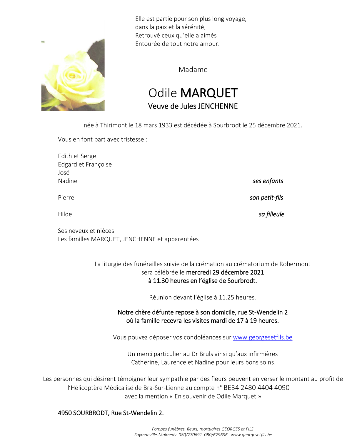 Décédée à Sourbrodt (4950) le samedi 25 décembre 2021 à l'âge de 88 ans
