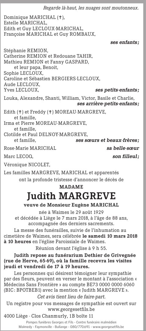 Décédée à Liège (4000) le mercredi 7 mars 2018 à l'âge de 88 ans