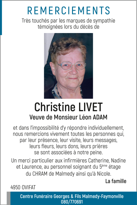 Décédée à Malmedy (4960) le jeudi 12 mars 2026 à l'âge de 97 ans