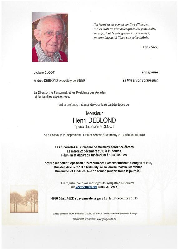 Décédé à Malmedy (4960) le samedi 19 décembre 2015 à l'âge de 85 ans