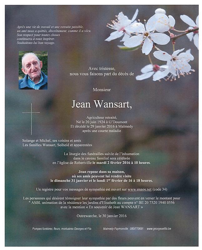 Décédé à Malmedy (4960) le vendredi 29 janvier 2016 à l'âge de 91 ans