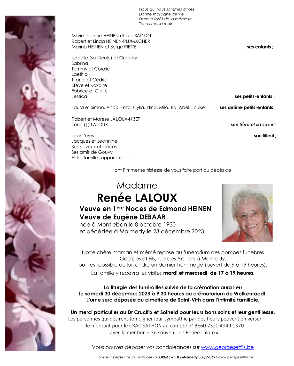 Décédée à Malmedy (4960) le samedi 23 décembre 2023 à l'âge de 93 ans