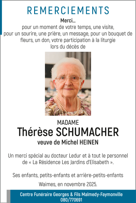 Madame Thérèse SCHUMACHER veuve de Michel HEINEN