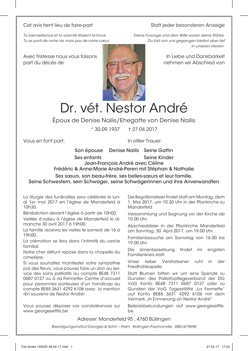 Décédé à Manderfeld (4760) le jeudi 27 avril 2017 à l'âge de 79 ans