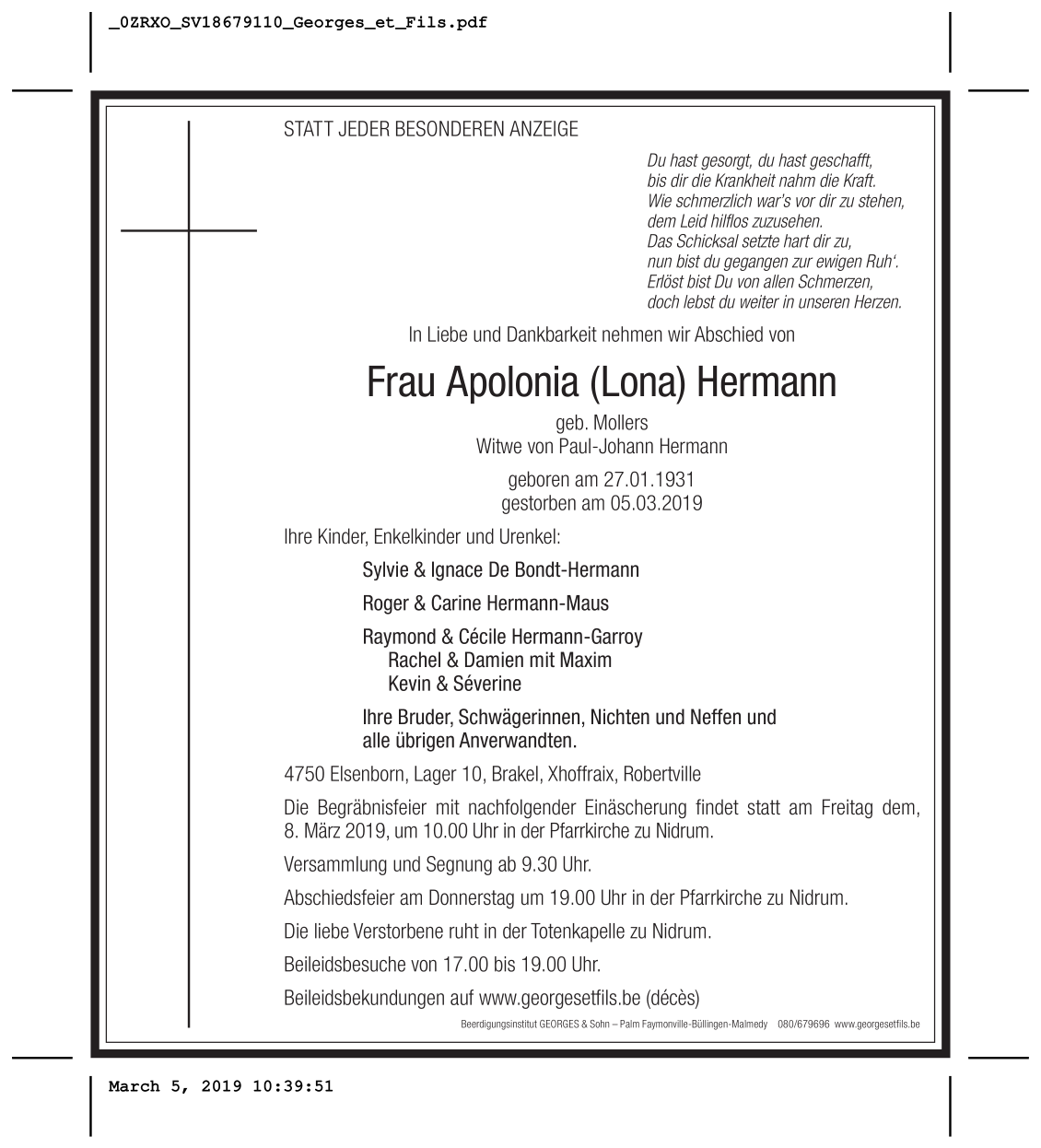 Décédée à Malmedy (4960) le mardi 5 mars 2019 à l'âge de 88 ans