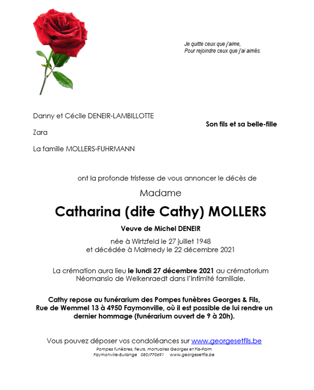 Décédée à Malmedy (4960) le mercredi 22 décembre 2021 à l'âge de 73 ans