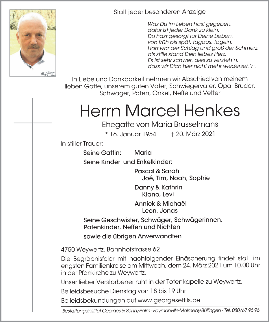 Décédé à Saint-Vith (4780) le samedi 20 mars 2021 à l'âge de 67 ans