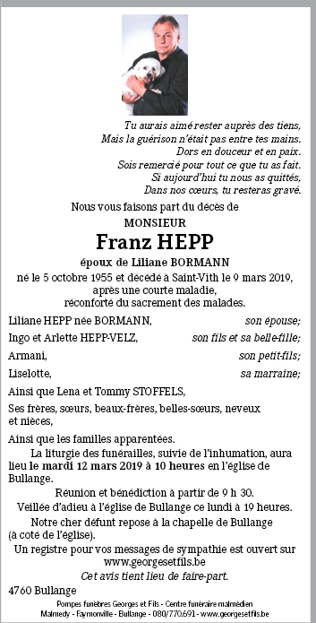 Décédé à Saint-Vith (4780) le samedi 9 mars 2019 à l'âge de 63 ans