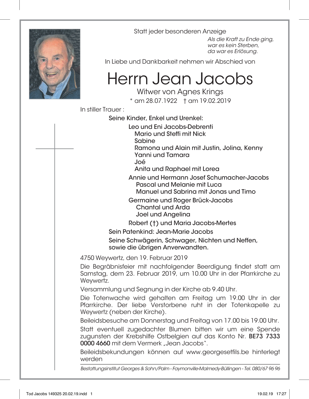 Décédé à Bütgenbach (4750) le mardi 19 février 2019 à l'âge de 96 ans