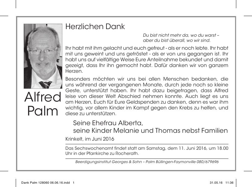 Décédé à Rocherath (4761) le mardi 26 avril 2016 à l'âge de 63 ans