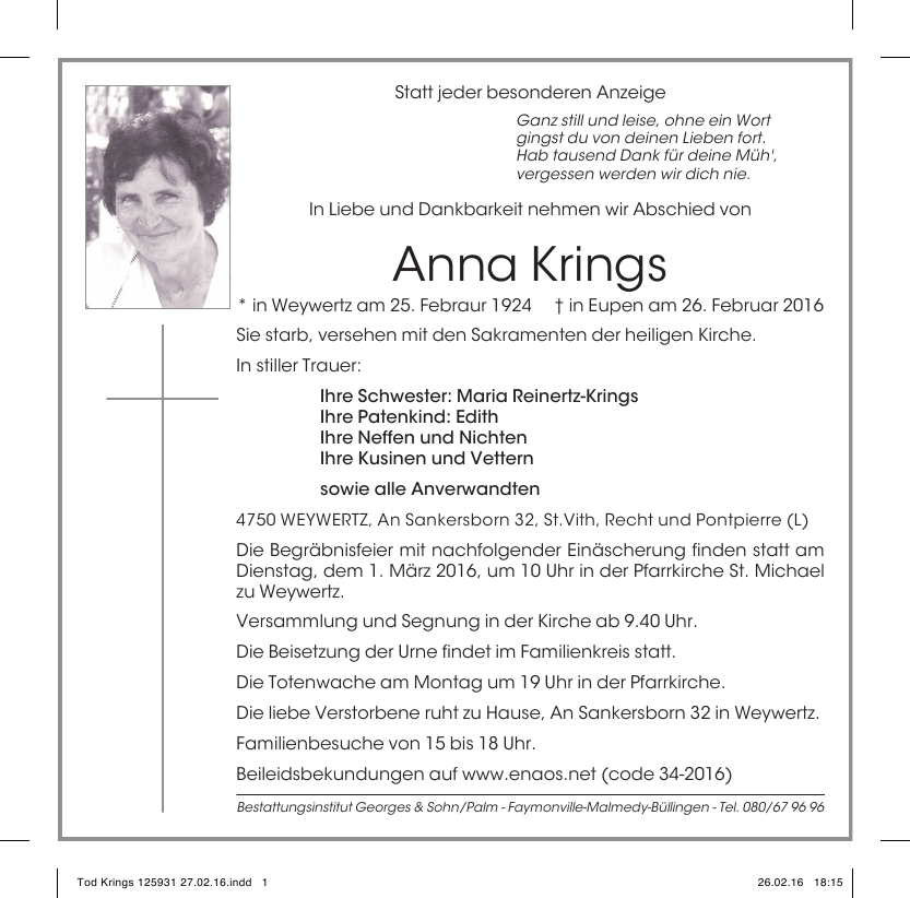 Décédée à Eupen (4700) le vendredi 26 février 2016 à l'âge de 92 ans