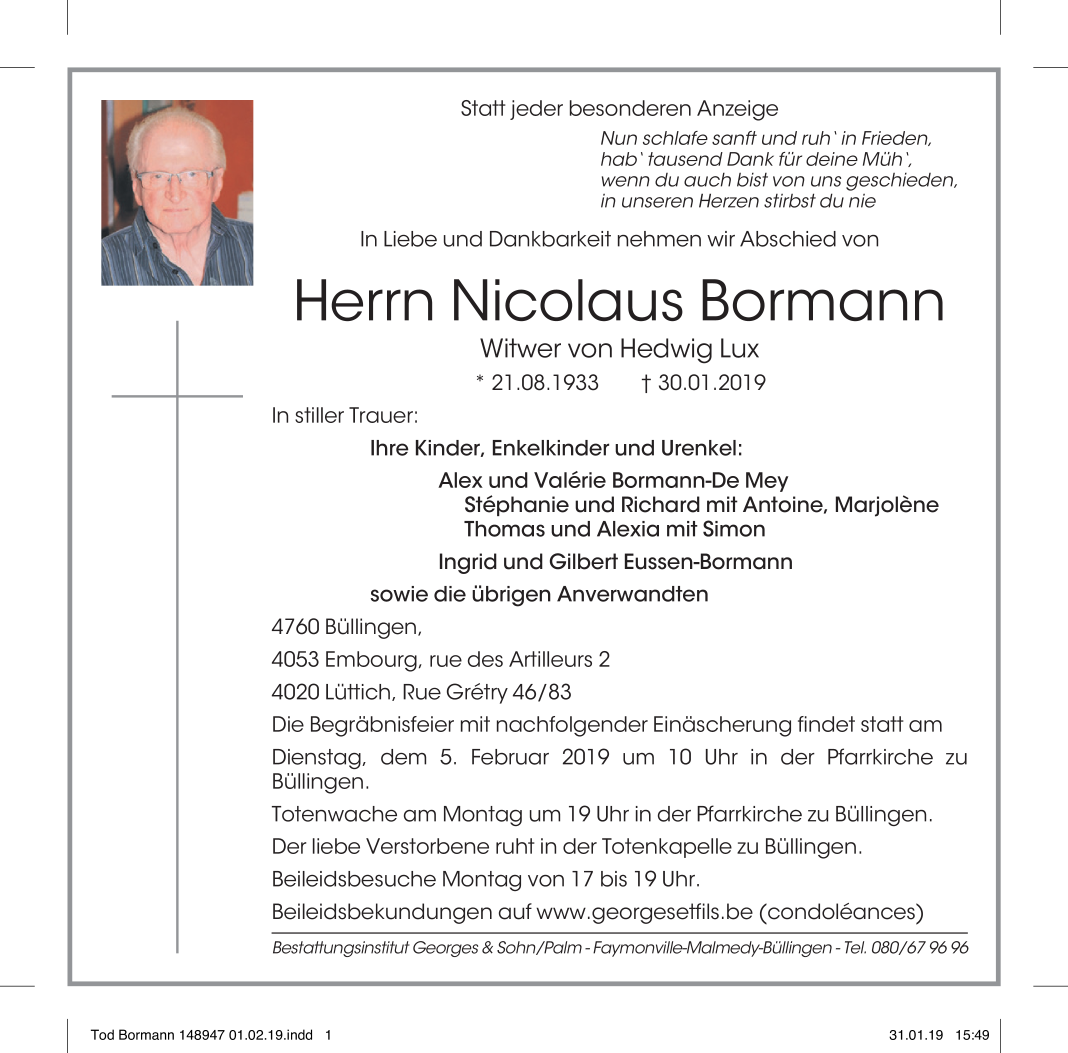 Décédé à Bütgenbach (4750) le mercredi 30 janvier 2019 à l'âge de 85 ans
