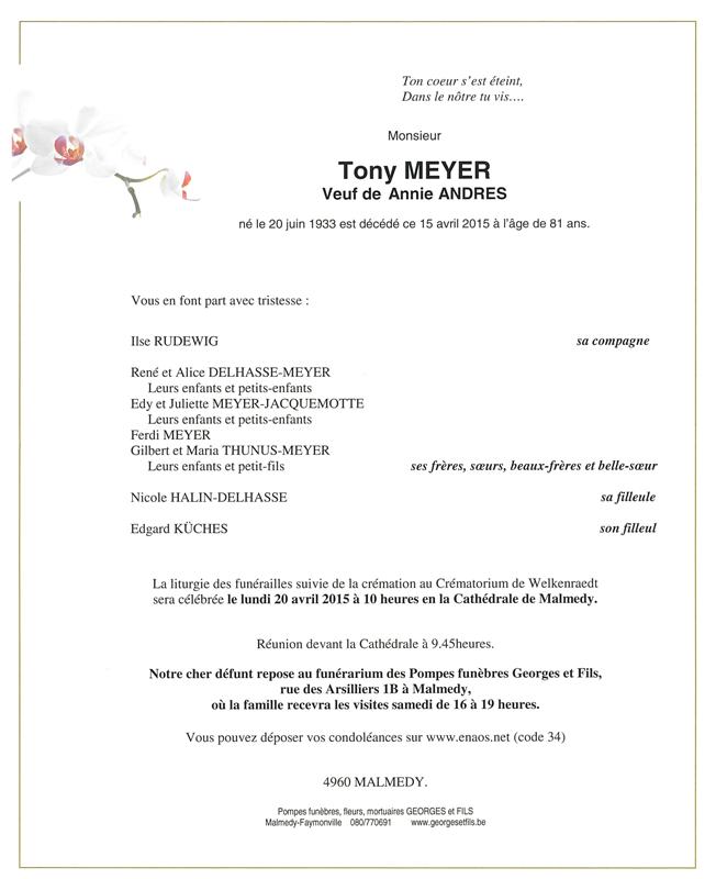Décédé à Saint-Vith (4780) le mercredi 15 avril 2015 à l'âge de 81 ans