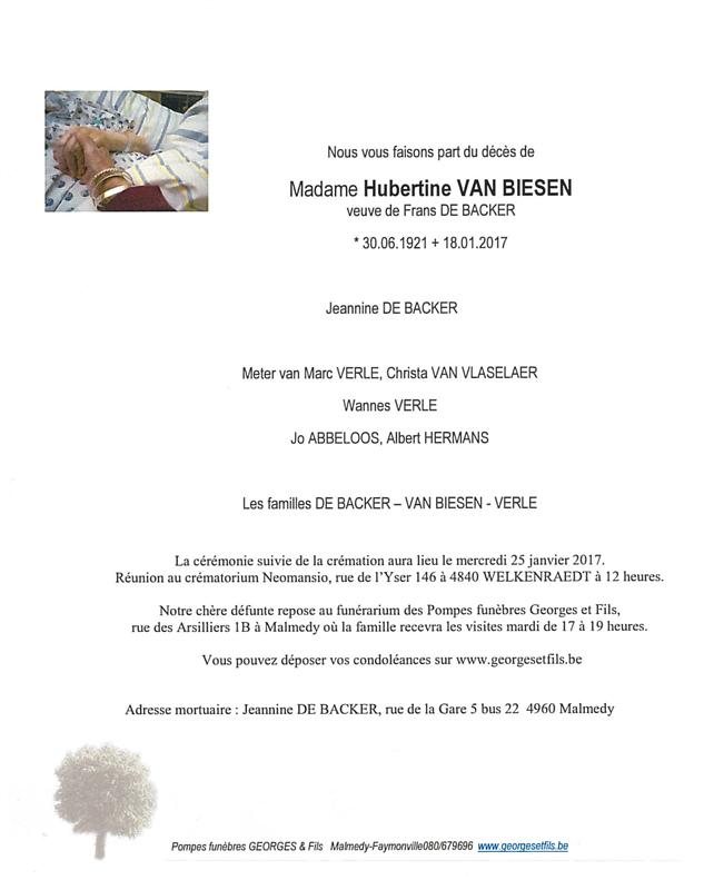 Madame Hubertine VAN BIESEN veuve de Frans DE BACKER