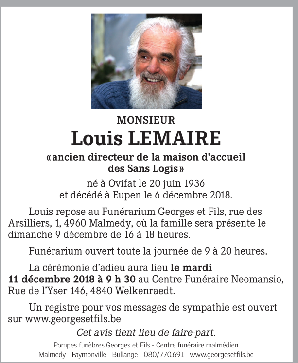 Décédé à Eupen (4700) le jeudi 6 décembre 2018 à l'âge de 82 ans